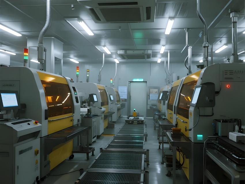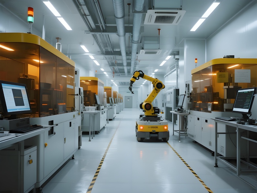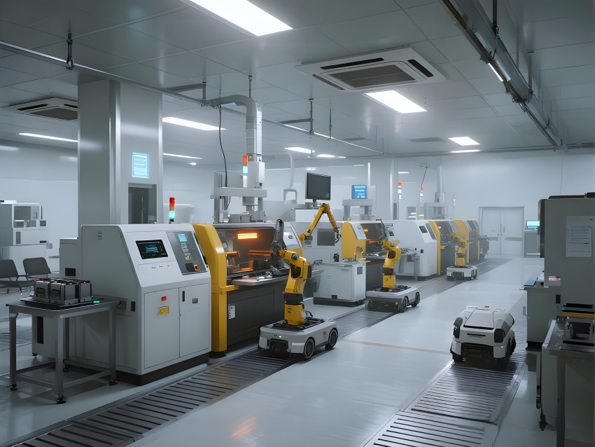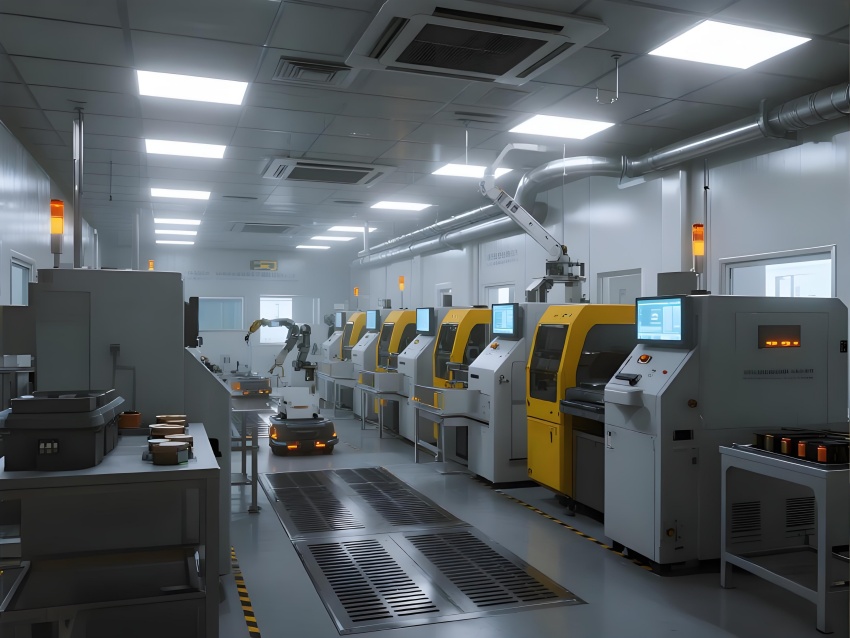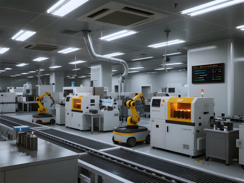 本車間以“精密制造+極致潔凈”為核心,采用未來工業(yè)風(fēng)設(shè)計(jì),主色調(diào)為冷銀灰與警示黃,強(qiáng)化功能分區(qū)。頂棚矩陣式FFU單元配合地面格柵回風(fēng),形成垂直層流,藍(lán)色氣流軌跡可視化突顯潔凈度。電極區(qū)配備全封閉涂布機(jī),機(jī)械臂精準(zhǔn)運(yùn)作;電芯裝配區(qū)采用防靜電工作臺,激光焊接火花與冷色調(diào)環(huán)境形成對比。注液區(qū)全封閉氮?dú)馐痔紫浯钆溏晟瘓?bào)燈,確保絕對干燥。化成區(qū)排列著智能溫控柜,數(shù)據(jù)看板實(shí)時(shí)監(jiān)控電池參數(shù)。AGV機(jī)器人沿磁軌穿梭,與懸吊式管道系統(tǒng)構(gòu)成高效物流網(wǎng)絡(luò)。整體空間融合精密機(jī)械的冷峻美學(xué)與智能制造的科技感,打造高可靠性的鋰電池生產(chǎn)環(huán)境。