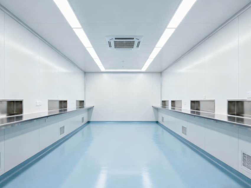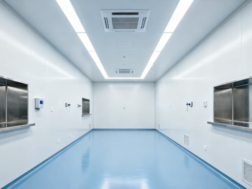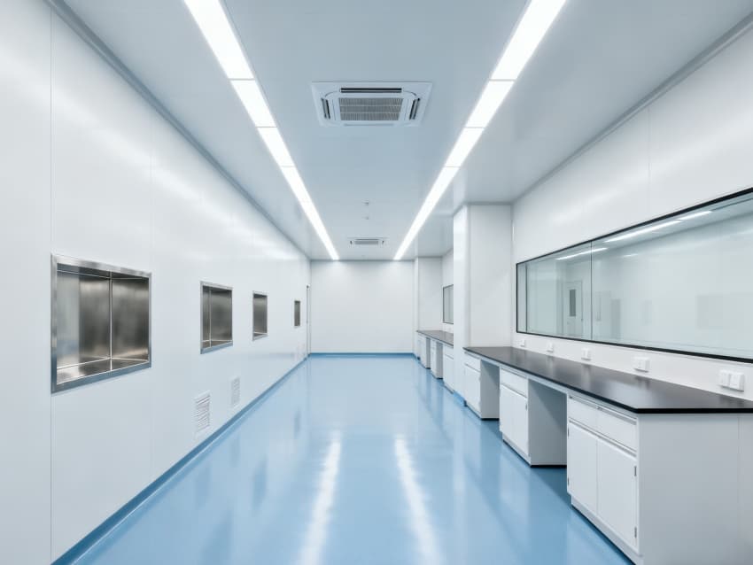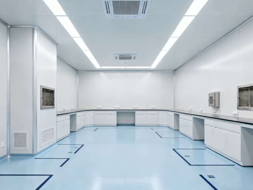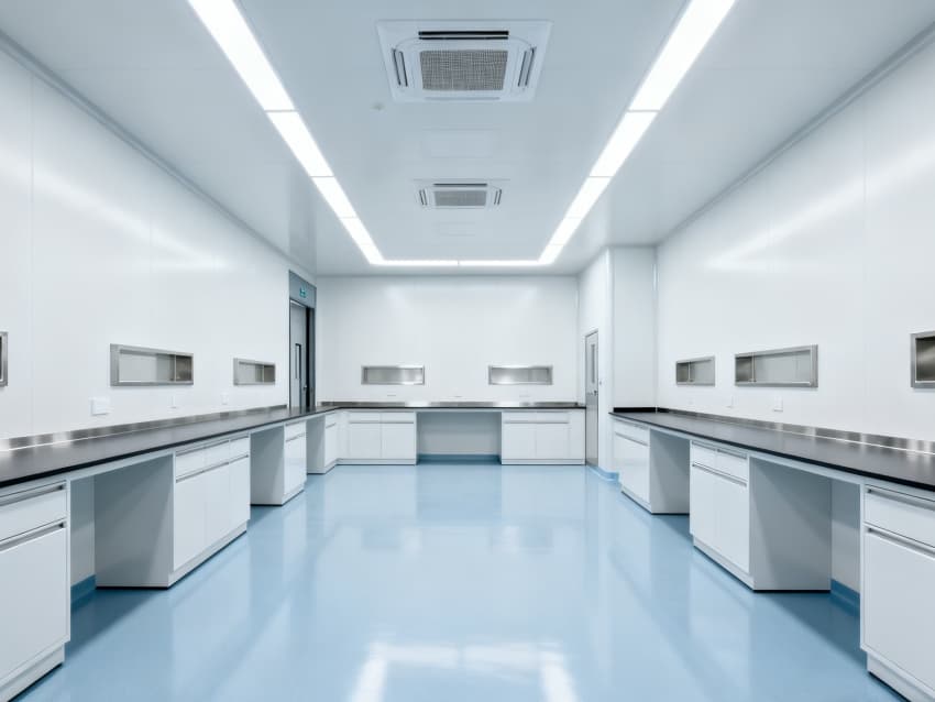 內(nèi)部6個實(shí)驗(yàn)室均為無設(shè)備空曠布局,按萬級潔凈標(biāo)準(zhǔn)建設(shè):地面鋪設(shè)無縫抗菌環(huán)氧自流平,墻面采用食品級不銹鋼潔凈墻板,陰陽角做R40圓弧處理杜絕積塵死角;柱網(wǎng)間距設(shè)為7.5米,預(yù)留實(shí)驗(yàn)臺、精密檢測設(shè)備安裝點(diǎn)位及運(yùn)維通道;頂部整合高效新風(fēng)過濾系統(tǒng)、恒溫恒濕裝置與防眩光LED照明,所有管線暗藏于吊頂內(nèi),最大化釋放空間高度與視野;實(shí)驗(yàn)室間通過通透玻璃隔斷銜接,進(jìn)一步強(qiáng)化整體空曠感,為藥物合成、質(zhì)量檢測等核心研發(fā)環(huán)節(jié)提供安全、潔凈的專屬環(huán)境。