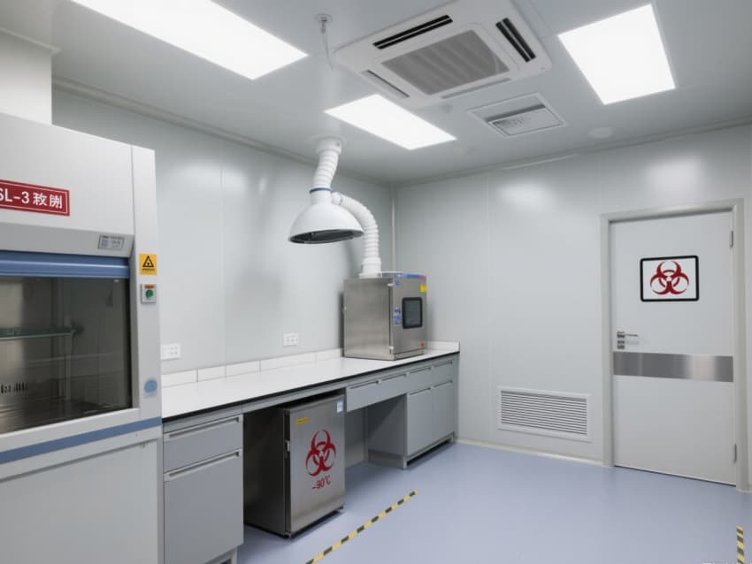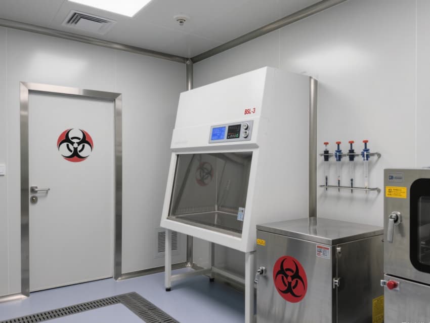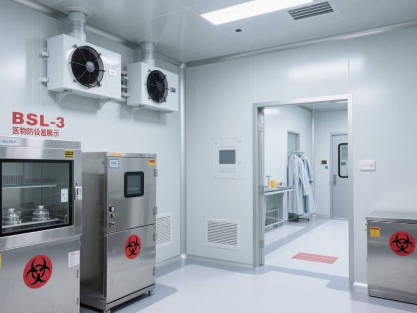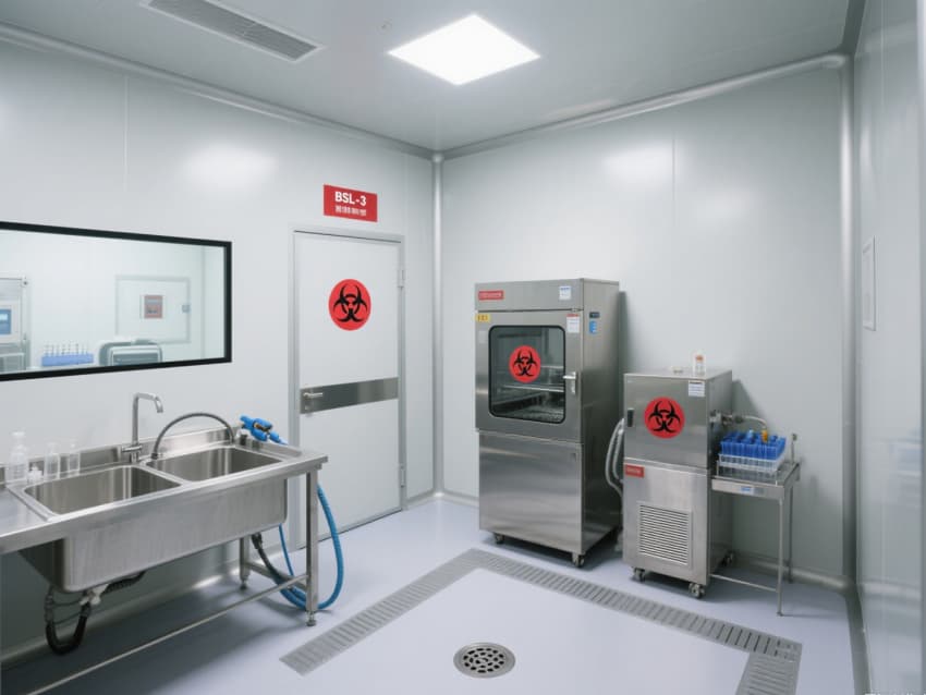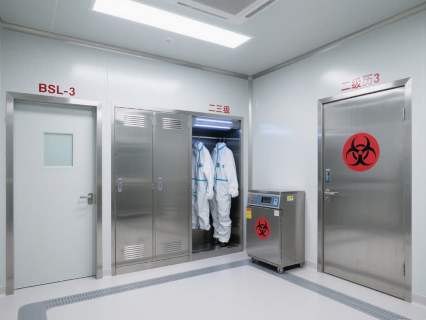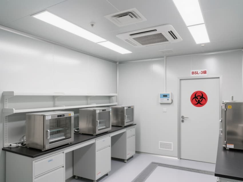 實(shí)驗(yàn)室核心區(qū)域配備負(fù)壓生物安全柜、雙扉高壓滅菌器,確保微生物操作與廢棄物處理安全;頂部高效空氣過(guò)濾器(HEPA)實(shí)現(xiàn)每小時(shí)15-20次空氣置換,尾氣經(jīng)消毒處理后排放,避免氣溶膠擴(kuò)散?;ユi式潔凈門(mén)、雙層鋼化玻璃觀察窗與應(yīng)急噴淋裝置,形成全流程安全保障。?