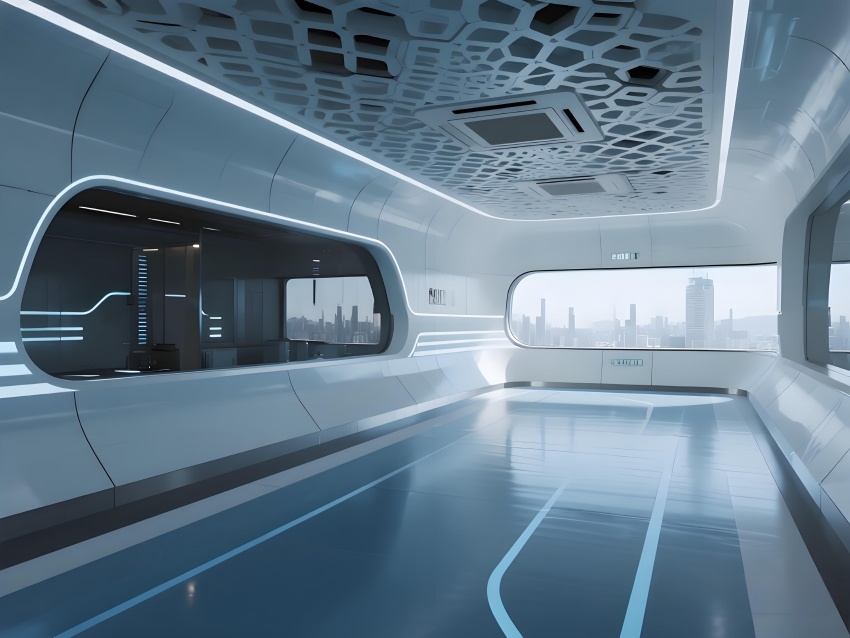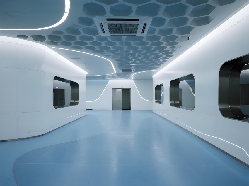 本車間空間以冰川藍與鈦白為主色調(diào),弧形墻角與無縫地坪構(gòu)成流暢的潔凈界面,頂部蜂窩狀FFU陣列形成科技感天花肌理。灌裝區(qū)透明亞克力防護罩展示自動化生產(chǎn)線運作,配合層流工作臺的紅色氣流可視化設(shè)計,強化無菌核心概念。功能模塊通過地面灰色導視帶串聯(lián),設(shè)備區(qū)的鏡面不銹鋼與控制面板的藍色背光形成冷調(diào)光效。玻璃觀察窗嵌入電子壓差計,走廊的漸變光環(huán)境引導系統(tǒng)在滿足GMP動態(tài)監(jiān)測要求的同時,營造出未來實驗室般的專業(yè)氛圍,緩解員工長時間密閉作業(yè)的疲勞感。