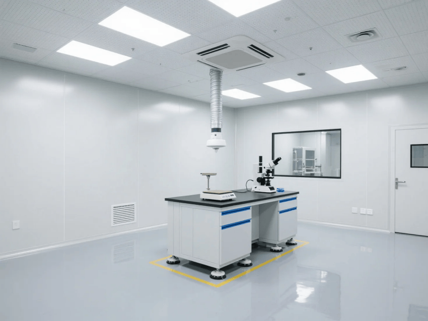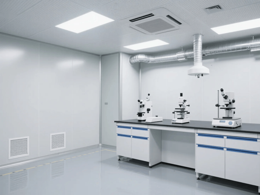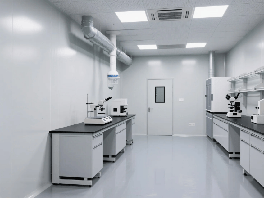 本方案采用高級(jí)灰與純白作為主色調(diào),打造嚴(yán)謹(jǐn)專業(yè)的實(shí)驗(yàn)環(huán)境。墻面選用50mm厚聚氨酯保溫彩鋼板,表面覆有抗菌涂層,接縫處采用無(wú)縫焊接工藝處理。地面鋪設(shè)2mm厚環(huán)氧自流平地坪,具有優(yōu)異的耐化學(xué)腐蝕性能,灰白相間的分區(qū)標(biāo)識(shí)既美觀又實(shí)用。