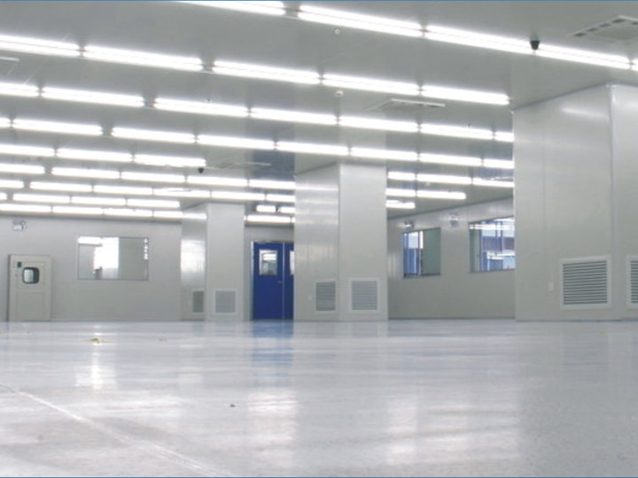 凈化廠房墻、頂板材一般多采用50mm厚的夾芯彩鋼板制造,其特點(diǎn)為美觀、剛性強(qiáng)。圓弧墻角、門、窗框等一般采用專用氧化鋁型材制造。地面采用環(huán)氧自流坪地坪,有防靜電