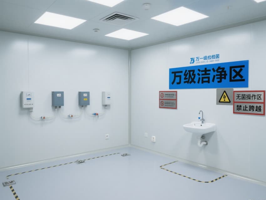 空間內配備不銹鋼潔凈門窗與雙扉傳遞窗,均采用高氣密性密封結構;嵌入式LED潔凈燈提供300-500lux均勻照明,無眩光設計保障操作精度。恒溫恒濕系統(tǒng)精準控制溫度(20-24℃)、濕度(45-60%),藍色功能標識線清晰劃分操作動線,全方位營造安全、穩(wěn)定的萬級無菌環(huán)境。