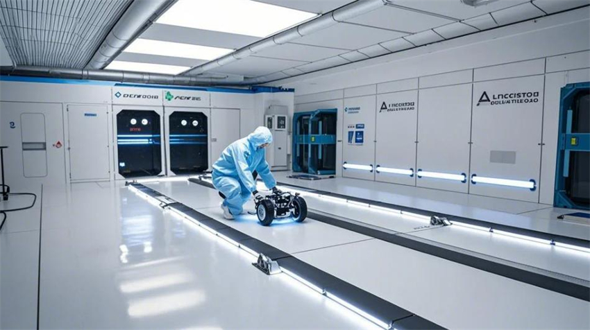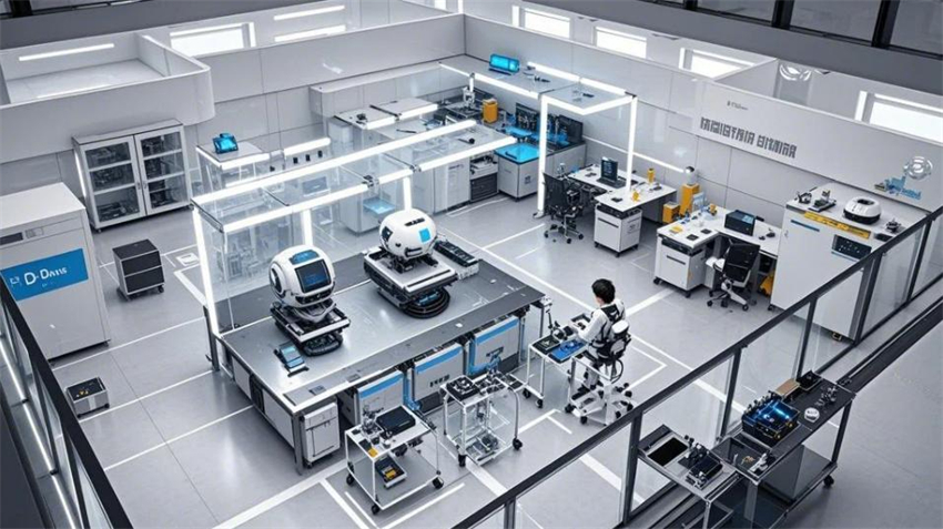 機(jī)械人研發(fā)實(shí)驗(yàn)室,未來科技風(fēng)格。實(shí)驗(yàn)室分為研發(fā)區(qū)、測試區(qū)、裝配區(qū)和辦公區(qū)。研發(fā)區(qū)占50%,測試區(qū)占30%,裝配區(qū)占10%,辦公區(qū)占10%。研發(fā)區(qū):防靜電環(huán)氧地坪(淺灰色),白色彩鋼板墻面和天花板,頂部高效過濾器(HEPA),不銹鋼工作臺,機(jī)械人原型和3D打印機(jī)排列整齊。測試區(qū):機(jī)械人測試平臺,地面為防靜電PVC地板(淺色)。裝配區(qū):工具架整齊,機(jī)械人部件分類存放。辦公區(qū):玻璃隔斷,現(xiàn)代簡約辦公桌。整體色彩:白色、淺灰色、科技藍(lán)點(diǎn)綴。