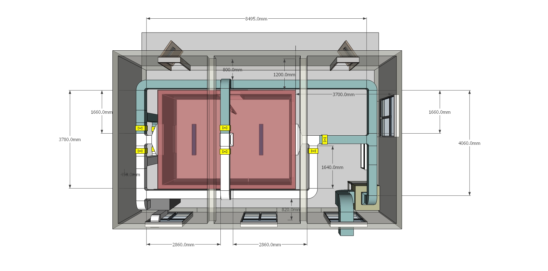 實(shí)驗(yàn)內(nèi)室尺寸: 5m×3.5m×2.5m(長(zhǎng)×寬×高)。